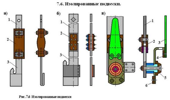 Локомотивные изолированные подвески (рис. 7.6 в) имеют поворотную ручку 4 с изоляционными накладками 5 и 6. С помощью поворотной ручки контактный палец утапливается внутрь корпуса головки для того, чтобы соединение рабочего и контрольного проводов имело место только на хвостовом вагоне поезда.