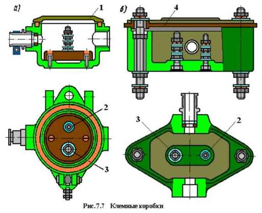 В электрических цепях ЭПТ применяются двухтрубные и трехтрубные клеммные коробки (рис. 7.7.).