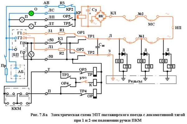 Сигнальная лампа «О» указывает на исправное состояние цепей линейных проводов, а лампа «Т» сигнализирует о том, что схема ЭПТ находится в положении торможения.