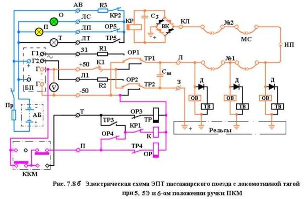 При III и IV положении ручки крана машиниста (перекрыша) (рис. 7.8 б) постоянный ток с выхода статического преобразователя через контакты микропереключателей контроллера ККМ обеспечивает питание катушки ОР по цепи: