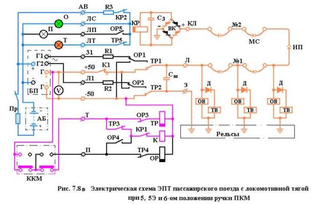 При этом на световом сигнализаторе загорается лампа «О», сигнализирующая машинисту о целостности линейных проводов ЭПТ. Для прохождения переменного тока имеются еще две цепи: