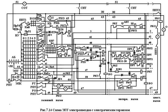 Ø провод 50, р.к. РТП, провод 50ПА, диод, провод 50А, вентиль ВТ ЭВР прицепного вагона, провод 43, контакты ППТ-3, провод (-)30.