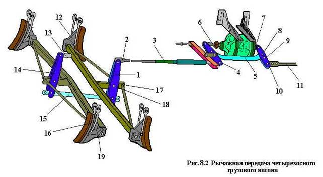 Устройство тормозной рычажной передача четырехосного грузового вагона показано на рис. 8.2. Шток 6 поршня тормозного цилиндра и кронштейн мертвой точки 7 соединены валиками с горизонтальными рычагами 10 и 4, которые в средней части связаны между собой затяжкой 5. Затяжка 5 устанавливается в отверстия 8 при композиционных колодках, а при чугунных колодках в отверстие 9. С противоположных концов рычаги 4 и 10 сочленены валиками с тягой 11 и авторегулятором 3. Нижние концы вертикальных рычагов 1 и 14 соединены между собой распоркой 15, а верхние концы рычагов 1 соединены с тягами 2, верхние концы крайних вертикальных рычагов 14 закреплены на рамах тележек с помощью серег 13 и кронштейнов. Триангели 17, на которых установлены башмаки 12 с тормозными колодками, соединены валиками 18 с вертикальными рычагами 1 и 14.