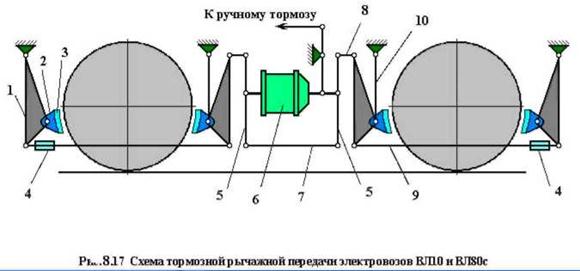 Тормозные цилиндры 6 диаметром 254 мм закреплены на кронштейнах, приваренных к шкворневому брусу рамы тележки. От штоков тормозных цилиндров усилия передаются на балансиры 5, связанные тягой 7 в нижних точках. Верхние концы балансиров 5 через серьги 8 передают усилие на подвески 1 и внутренние тормозные колодки и далее посредством тяг 9 на наружные подвески и тормозные колодки 3. Тормозные колодки 3 при помощи чек крепятся к башмакам 2, которые соединены с подвесками 1. Наружные подвески 1 прикреплены к концевым брусьям рамы тележки, а внутренние подвески соединены валиком с подвесками 10, присоединенными к кронштейнам на боковине рамы тележки. Через фигурные вырезы в нижней части подвесок проходят тормозные балки, соединенные попарно тягами 9, расположенными с внешней стороны каждой колесной пары.