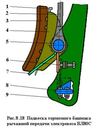 Выход штока тормозного цилиндра регулируется изменением длины тяги 9 при вращении муфты 4. Когда возможности регулировки выхода штока тормозного цилиндра посредством муфты 4 исчерпана ступенчатое регулирование осуществляется перестановкой валиков в последующие отверстия этих тяг. Зазоры между колодками и бандажом по концам каждой колесной пары регулируются разворотом колодок на валиках 5 (рис. 8.18) при помощи пружин 7 и упорных болтов 6. Предельное значение разности зазоров не должно превышать 5 мм, причем больший зазор должен быть на нижнем конце колодки.