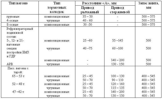 Справочные значения расстояния «А» между упором привода и корпусом авторегулятора на грузовых, рефрижераторных и пассажирских вагонах.
