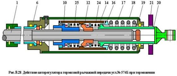 Действие авторегулятора усл.№ 574Б. в исходном положении тормоз находится в отпущенном состоянии (рис. 8.27). Расстояние «А» между упором привода 21 и торцом крышки 19 корпуса регулятора соответствует нормальной величине зазоров между колесом и колодкой.