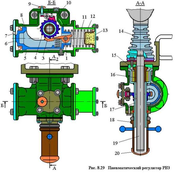 Пневматический регулятор одностороннего действия (рис. 8.29) устанавливается на электропоездах и соединяется шарнирно тягой 19 с задним вертикальным рычагом тележки.
