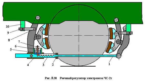 Реечный регулятор. На электровозах ЧС2 на каждой трехосной тележке установлено шесть реечных регуляторов рычажной передачи одностороннего действия (компенсаторы износа тормозных колодок). Регулятор (рис. 8.30) имеет корпус 4, который соединен с тормозным рычагом. Внутри корпуса находится зубчатая рейка 3, являющаяся продолжением тормозной тяги 1, защелка 5 и выключатель 7. Защелка прижимается к рейке 3 пружиной 6. Полость корпуса регулятора защищена от грязи и пыли уплотнением 2. В комплект регулирующего устройства входят также корректирующие планки 9, которые одним концом установлены на кронштейнах 10, а другим - с овальным отверстием, свободно насажены на валик 8. Такая установка планок обеспечивает зазор 7 мм между валиком и поверхностью овального отверстия в планке при отпущенном тормозе.