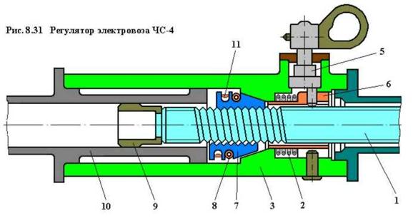 Авторегулятор на электровозах ЧС4 (рис. 8.31) состоит из корпуса 3, в который входит конец тяги 1 с резьбой и направляющей втулкой 9. На резьбу навернута гайка 7 из четырех сегментных частей, стянутых браслетной пружиной 8 и кольцом 11.