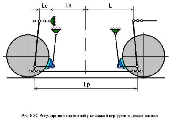 Ручная регулировка рычажной передачи вагона. Чтобы обеспечить постоянный запас винта регулятора при замене старых колодок на новые, следует устанавливать постоянную величину размера L (рис. 8.32.) замыкающего звена рычажной передачи тележки. Расстояние L -это расстояние между центром верхнего отверстия внутреннего вертикального рычага и центром подпятника. Оно увеличивается вследствие износа колодок и уменьшения диаметра колес. Автоматический регулятор стягивает рычажную передачу по мере износа тормозных колодок, а увеличение размера L вследствие уменьшения диаметра колес компенсируют изменением длины серьги Lс и распорки тяги Lр. Регулировка носит не плавный характер, а ступенчатый: