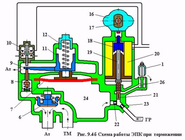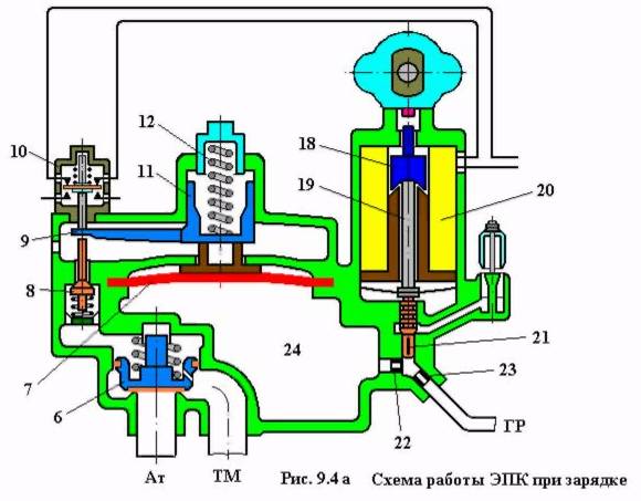 ЭПК имеет кронштейн 5, к которому присоединены трубопроводы от ГР и ТМ, а также атмосферная труба Ат1. В этом же кронштейне расположена камера 24 выдержки времени объемом 1 л. На верхней части кронштейна смонтированы все узлы ЭПК.
