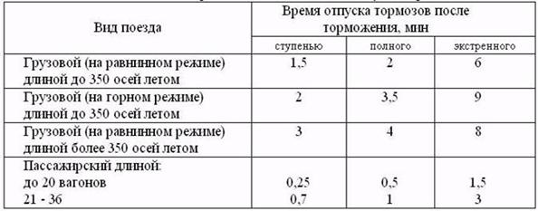Ступенчатый отпуск тормозов производят с таким расчетом, чтобы остановить поезд при небольшом давлении в тормозных цилиндрах. Минимальная ступень отпуска по давлению в тормозных цилиндрах составляет 0,2 - 0,3 кгс/см2. Полный отпуск ЭПТ в один прием выполняют постановкой ручки крана машиниста в I положение до повышения давления в уравнительном резервуаре до 5,2 - 5,4 кгс/см2. Затем ручку крана возвращают в поездное положение.