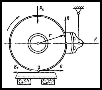 Если к катящему по рельсу колесу, нагружённому силой Р (рис.), прижать тормозную колодку с силой К, то между поверхностью катания колеса и колодкой возникает сила трения B=Kjк, где jк – коэффициент трения между колодкой и колесом.