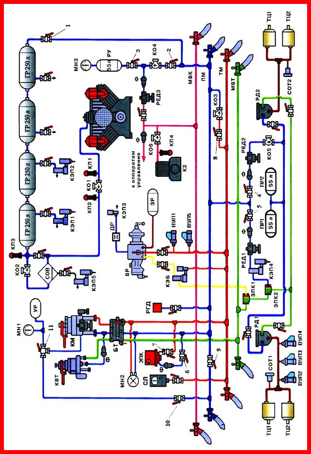 Схема пневматического тормозного оборудования электровоза ВЛ-11м постоянного тока.