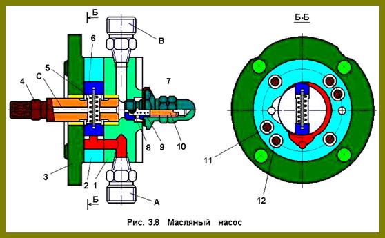 Крышка, 2- корпус насоса, 3- фланец, 4- валик, 5,9- пружины, 6- лопасть, 7- корпус редукционного клапана, 8- собственно клапан шарового типа, 10- регулировочный винт, 11-штифт, 12- шпильк