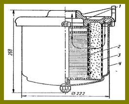 Предназначен для очистки всасывающего в компрессор сжатого воздуха и состоит из фланца 1, кожуха 4 и сетчатых цилиндров 2 и 3, между которыми заложена фильтрующая набивка из конского волоса или латунной проволоки диаметром 0,05 мм, или помещены три кольца из капронового волокна, обработанного специальной эмульсией. Во фланце имеется резьбовое отверстие для подключения к всасывающей трубе компрессора.