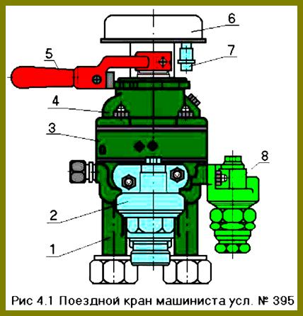 Поездной кран (Рис. 4.1) состоит из пяти пневматических частей: корпуса нижней части 1. редуктора зарядного давления 2, средней части 3, крышки 4, стабилизатора темпа ликвидации сверхзарядного давления 8 и электрического контроллера 6.