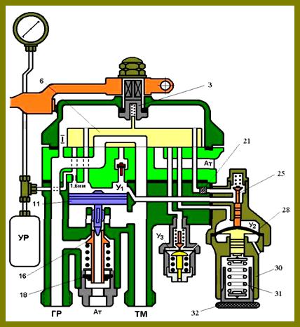 Сжатый воздух из питательной магистрали проходит в камеру над золотником и по двум широким каналам в тормозную магистраль. Первый путь - по выемке золотника 6, второй - по открытому впускному клапану 16. Впускной клапан открыт хвостовиком уравнительного поршня 11, на который оказывает давление воздух камеры над уравнительным поршнем У1.