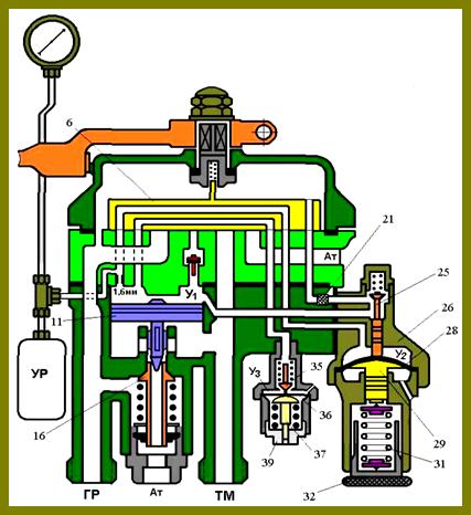 Уравнительный резервуар УР и камера над уравнительным поршнем У1, сообщается золотником с камерой У2, над металлической диафрагмой 28 редуктора и камерой над возбудительным клапаном 35 стабилизатора. Усилием пружины 39 диафрагма 36 прогибается вверх и открывает возбудительный клапан 35. Воздух уравнительного резервуара проходит в камеру У3 над диафрагмой 36 и по калиброванному отверстию диаметром 0,45 ммвыходит в атмосферу. Давление воздуха в камере У3 поддерживается постоянным соответственно усилию пружины 39. Так как истечение воздуха из уравнительного объема в атмосферу происходит все время при постоянном давлении в камере У3, то стабилизатор обеспечивает постоянный темп ликвидации сверхзарядного давления из уравнительного объема.
