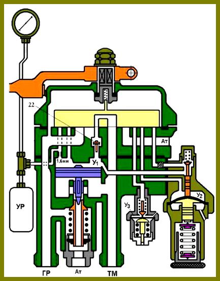 С момента, когда давление в камере У1 над уравнительным поршнем выравнивается с давлением в УР, т.е. становится зарядным, воздух из ГР будет проходить в ТМ по впускному клапану только зарядным давлением.