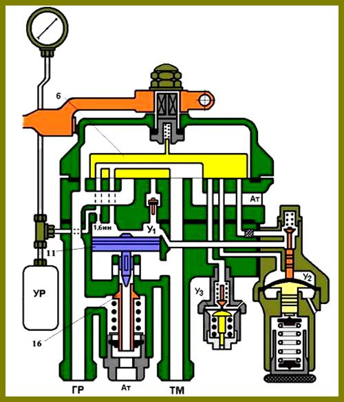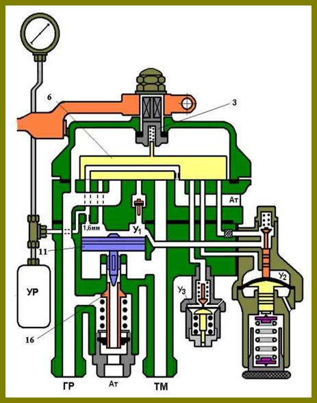 Золотник сообщает уравнительный резервуар с атмосферой по каналу диаметром 2,3 мм. Давление в камере над уравнительным поршнем У1 падает темпом 0,2 кгс/см2 - 0,25 кгс/см2 за секунду. Уравнительный поршень поднимается вверх давлением тормозной магистрали, и хвостовик поршня (выпускной клапан) отходит от своего седла во впускном клапане 16. Воздух из тормозной магистрали по осевому каналу клапана 16 выходит в атмосферу.