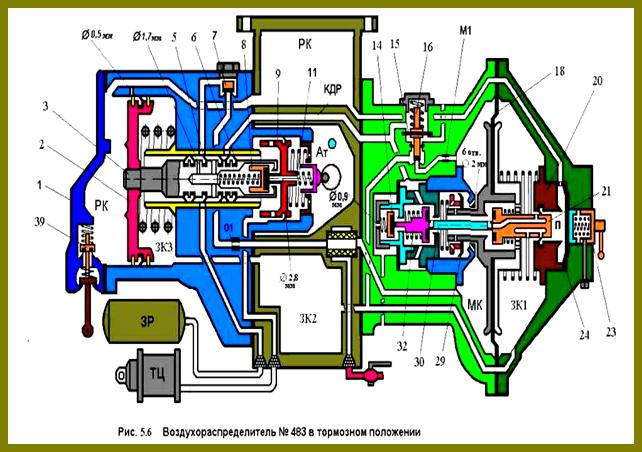 При медленном снижении давления в ТМ темпом до 0,3 – 0,4 кгс/см2 в минуту воздух из РК перетекает в ЗК, а оттуда в М К через отверстие диаметром 0,9 мм в канале клапана мягкости. При этом давления в МК и ЗК выравниваются и прогиба магистральной диафрагмы в тормозное положение (влево) не происходит. Клапан дополнительной разрядки 32 остается закрытым.