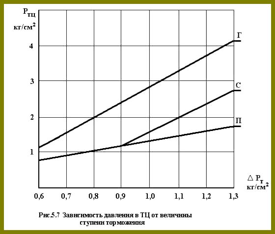 Чем сильнее давление режимных пружин 10 и 11 на уравнительный поршень, тем при большем давлении воздуха в ТК он начнет движение в положении перекрыши. Поэтому для получения различных режимов торможения (порожнего, среднего и груженого) изменяют усилие режимных пружин 10 и 11 на уравнительный поршень. Это достигается изменением положения рукоятки переключателя режимов торможения. (Табл. 5.1). Зависимость давления в ТЦ на различных режимах от ступени торможения показана на рис. 5.7.