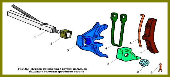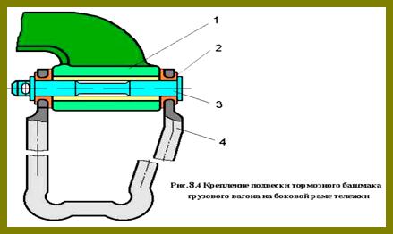 Наиболее ответственными деталями рычажной передачи грузовых вагонов являются триангели с глухой посадкой тормозных башмаков 3 (рис. 8.3). Закладка 2 устанавливается с внутренней стороны башмака. Размещенный за башмаком наконечник 5 ложится на полочку боковой балки тележки в случае обрыва подвески 4 и предохраняет триангель от падения на путь. Смонтированные на цапфах детали закрепляются корончатыми гайками 8 и фиксируются шплинтами 9. Колодки 7 крепятся в башмаках чеками 6. Триангель шарнирно соединяется с боковыми балками тележки посредством подвесок 4. Все грузовые вагоны должны иметь подвески башмаков с резиновыми втулками в отверстиях (рис. 8.4). Это позволяет снять нагрузки с подвески, вызывающие усталостные трещины, предупреждает изломы и падение деталей на путь.