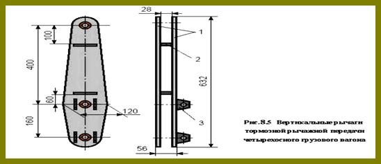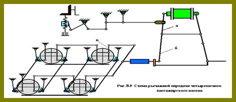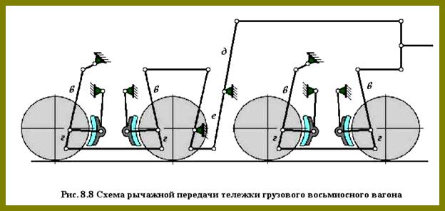 Особенность конструкции рычажной передачи восьмиосных вагонов (рис. 8.8) состоит в наличии балансира, обеспечивающего распределение тормозного усилия на обе тележки.