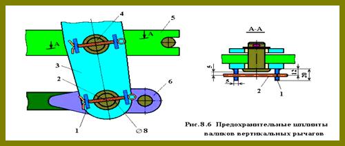 Для повышения надежности рычажной передачи и предупреждения падения затяжек и тяг обе полосы 1 (рис. 8.5) каждого вертикального и горизонтального рычага сваривают между собой планками 2. Соединительные валики при постановке в отверстия таких рычагов крепятся как обычно шайбой и шплинтом диаметром 8 мм.