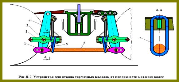 С целью удержания тормозных колодок с зазором относительно поверхности катания колеса в положении отпуска между распорками 2 (рис. 8.7) триангеля и вертикальным рычагом 4 устанавливают отводящее устройство в виде скобы 5, которую надевают, разъединив распорку 6 и вертикальный рычаг 4. После соединения валиком 1 распорки и рычага скоба 5 удерживает триангель от поворота относительно валика 3 и обеспечивает зазор между колесом и колодкой.