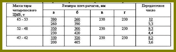| Тип вагонов | Диаметр ТЦ, дюйм | Размер плеч рычагов | Тип колодок | Перед. Число | |||||
