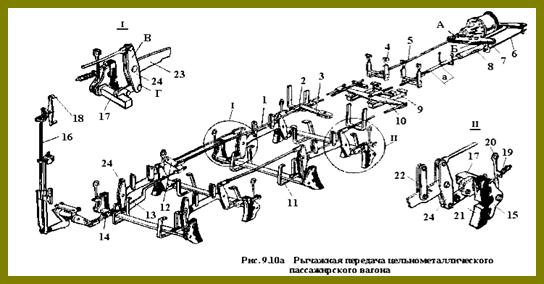 Рычажная передача пассажирского вагона (рис.8.10) отличается от передач грузовых вагонов тем, что вместо триангелей применены траверсы 17, на цапфы которых установлены башмаки 15 с тормозными колодками 21. Вертикальные рычаги 24 и затяжки 28 подвешены к раме на подвесках 22.