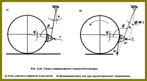 Угол α между горизонтальной осью колеса и осью тормозной колодки (рис. 8.25 а) называется углом наклона тормозной колодки. На вагонах он обычно не превышает 10°, а на локомотивах - 30°. Угол β между осью подвески и линией, соединяющей нижний конец подвески с центром оси колесной пары, называется углом подвешивания тормозных колодок. При среднеизношенных колодках угол β составляет примерно 90°. Условия отвода колодок определяются величиной угла γ между осью подвески и вертикальной линией, проведенной через точку подвески. Угол у изменяется пределах от 4: до 30°.