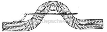 ù При ручном сметывании непроизвольно посаживается верхняя деталь. Это происходит потому, что при прокалывании иглой у верхнего слоя ткани захватывается большая длина, чем у нижнего (см рисунок). Чтобы избежать этого, верхнюю деталь в момент прокола иглой следует слегка натягивать.