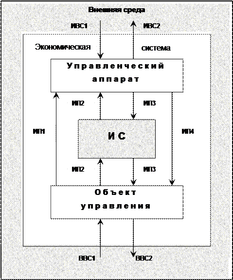 Обычно ИС рассматривается в качестве составной части или связующего элемента системы управления объектом, которая призвана обеспечить связь объекта управления и системы управления между собой и с внешней средой посредством соответствующих информационных потоков. Обобщенная структура и место экономической системы с позиции организации управления представлена на рис. 1.1