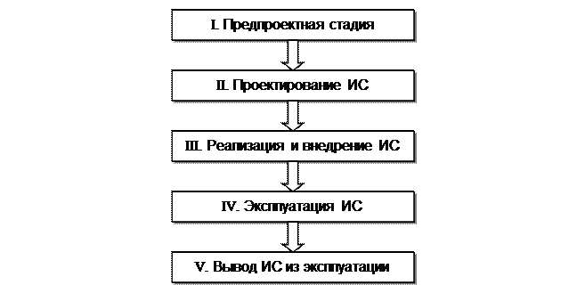 I. Предпроектная стадия, включающая в себя планирование, анализ, технико-экономическое обоснование и выбор путей создания ИС. На этой стадии могут выполняться научно-исследовательские работы (НИР), а также разрабатываться концепция ИС. Завершается предпроектная ста дия обычно разработкой технического задания (ТЗ) на дальнейшее проведение работ по проектированию ИС (если она создается заново) или на приобретение и адаптацию типового проектного решения (если выбран вариант типового проектирования ИС).