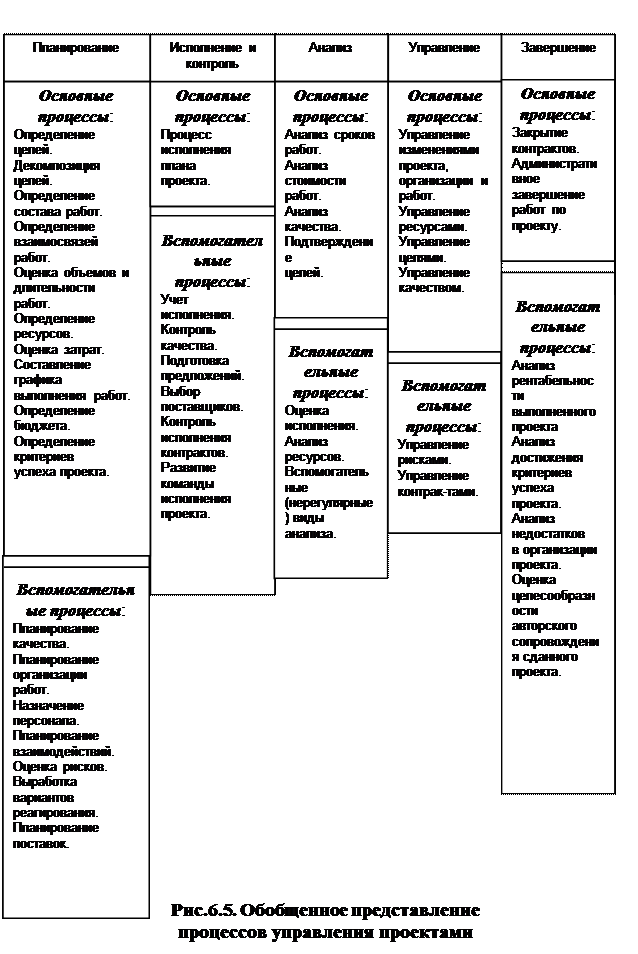 Процессный подход к управлению проектами, получил в последнее время распространение в мире. Процессы управления проектами, под которыми понимают действия и процедуры, связанные с реализацией функций управления, представлены в обобщенном виде на рисунке 6.5.