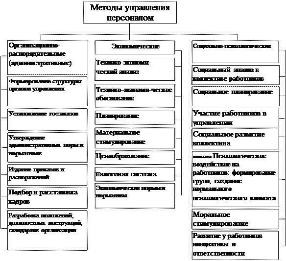 Методы управления персоналом зависят от принятой в организации политики (стратегии), которая в свою очередь определяется необходимостью учета трех групп факторов: экономических, организационно-распорядительных и социально-психологических (чисто человеческих) см. рис 9.3.