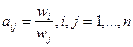 Сравнивая набор критериев друг с другом, получим следующую матрицу (матрицу парных суждений, которая содержит оценки или суждения об относительной важности): A={aij}i,j=1,..,n. Эта матрица обратно симметрическая, т.е. имеет место свойство aij=1/aji (aij – превосходство i-го элемента над j-м.), где индексы i и j - номер строки и номер столбца, на пересечении которых стоит элемент. При сравнении элемента с самим собой имеем равную значимость, так что на пересечение строки и столбца с одинаковыми номерами заносим единицу. Поэтому главная диагональ должна состоять из единиц.