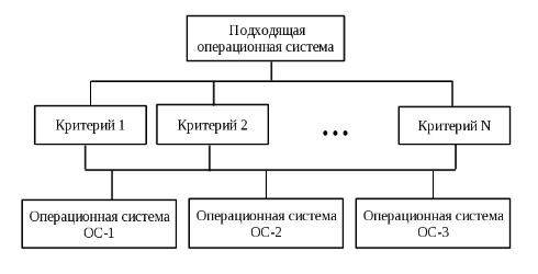 Пример. Мы рассмотрим небольшой пример, иллюстрирующий возможный подход к выбору ОСРВ на основе МАИ. Итак, иерархия строится с вершины – цели анализа (в нашем случае это – операционная система, которую надо выбрать), через промежуточные уровни (критерии, по которым производится сравнение вариантов) к нижнему уровню (который является перечислением альтернатив). Пример возможной иерархии для выбора одной операционной системы из трех представлен на рисунке ниже.