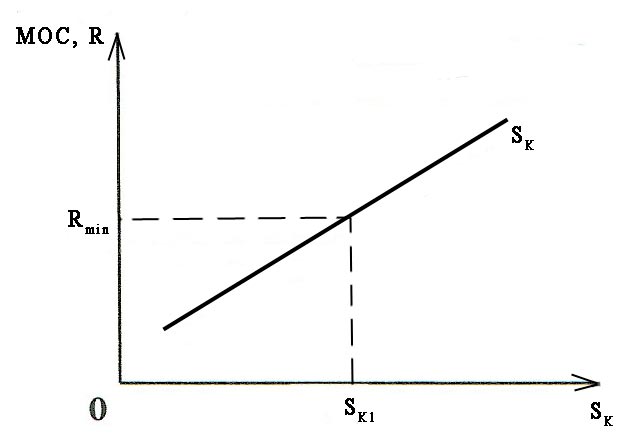 На графике кривая предложения имеет вид положительной кривой. На вертикальной оси откладывается цена на услуги капитала (или рентная оценка) R, а также предельные издержки упущенных возможностей (MOC), а на горизонтальной оси - количество услуг капитала (SK).