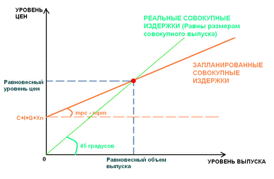 Равновесным здесь считается такой объем производства, который обеспечивает равенство совокупных расходов в экономике и объема произведенной в обществе продукции. Равновесный объем производства — равновесный ВВП — такой объем производства, который обеспечивает совокупные расходы, достаточные для реализации данного объема производства, т. е. при равновесном ВВП общая стоимость произведенных товаров равна стоимости реализованных (приобретенных) товаров: равновесный ВВП = AЕ, или равновесный ВВП = С+ I&. Это условие, при котором вся произведенная продукция раскупается, т. е. на национальном рынке нет ни излишков, ни дефицита продукции.