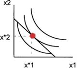 Равновесие потребителя – точка, в которой потребитель максимизирует свою общую полезность или удовлетворение от расходования фиксирования дохода; равновесие потребителя достигается в точке, в которой бюджетная линия касается наивысшей кривой безразличия. Оптимальный набор благ должен соответствовать требованиям: находится в пределах линии бюджетных ограничений (на ней, а не под ней, иначе в модели появляется третье благо – дающие удовлетворение сбережения). Этому соответствует точка касания бюджетной линии и самой высокой кривой безразличия, с ней пересекающейся.