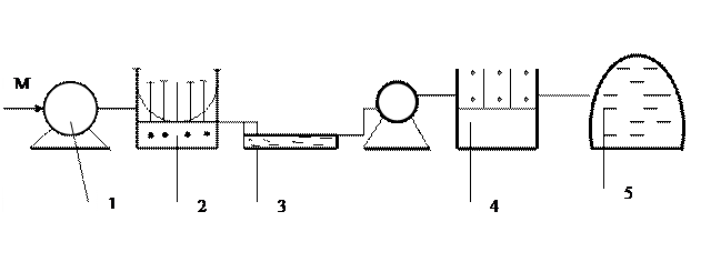 1 - насос, подающий мазут в нагревательную печь 2 (нагрев до t=350…400 °С). Далее мазут отводится в водогрязеотстойник 3, откуда при помощи насоса очищенный мазут передаётся в вакуумную нагревательную печь 4 и далее в ратификационную колонну 5, где пары мазута конденсируются и отбираются дистилляторами, которые содержат в себе примеси органических кислот, щелочей, азотнокислые соединения и асфальто-смолянистые включения. Дистилляторы смешивают в определённой пропорции и на выходе этой печи получаются разные виды смазок.