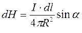 Любой элемент проводника длиной dl, по которому течет ток силой I создаёт на расстоянии R магнитное поле напряжённостью dH, величина которой прямо пропорциональна произведению силы тока на длину элемента, обратно пропорциональна квадрату расстояния от элемента до рассматриваемой точки.