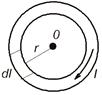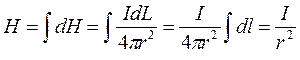 Элемент dl в точке О создаёт магнитное поле напряжённостью dH. Любой другой элемент этого кольца создаёт магнитное поле такой же напряжённости, все векторы dH направлены в одну сторону, поэтому их можно сложить.