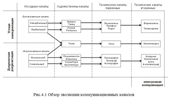 Невербальный и вербальный каналы в их неразрывном единстве послужили исходной базой для формирования устной коммуникации; иконический и символьный каналы положили начало документной коммуникации. Устная и документная коммуникации сыграли определяющую роль в становлении ороакустической (словесной) и книжной культуры. Исходные каналы дали толчок для появления новых искусственных каналов, которые по своему источнику делятся на две группы: художественные и технические. Художественные коммуникационные каналы: музыка и танец – производные невербального канала; поэзия и риторика –производные вербального канала; театр – синтетический вид искусства; графика и живопись – производные иконического канала; скульптура и архитектура – производные канала символьных документов. Изобретение письменности стало открытием еще одного документного канала. Письменность – результат эволюции иконического канала.