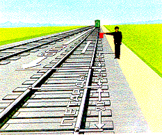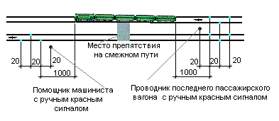 | Проводник последнего пассажирского вагона, ограждающий остановившийся поезд, должен привести в действие ручной тормоз, уложить на расстоянии 800 м от хвоста поезда петарды, после чего отойти от места уложенных петард обратно к поезду на 20 м и показывать ручной красный сигнал в сторону перегона (рис. 3. 16). |